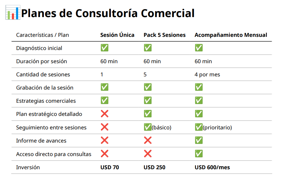 Nuestra consultoría comercial está diseñada para ayudar a las PYMEs a aumentar sus ventas, mejorar sus procesos comerciales y optimizar la gestión de clientes mediante el uso de tecnología y estrategias probadas.